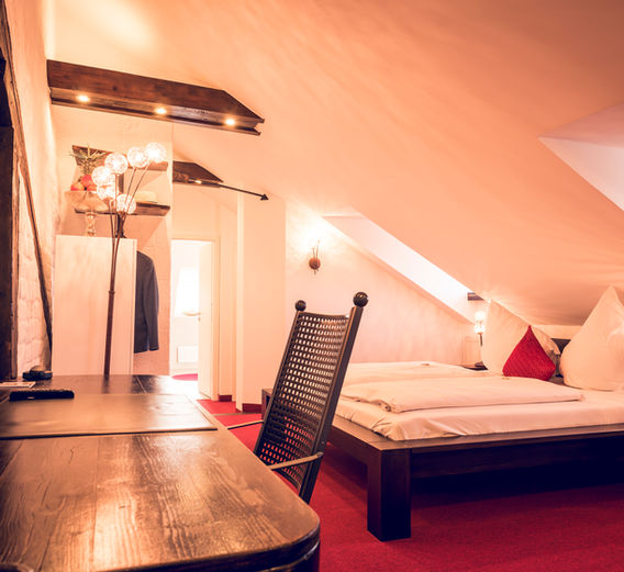 Diese Zimmer versprühen Ihren eigenen Charme und gewinnen durch den Sitz direkt unter dem Mansardendach des Schlosses eine besonders behagliche Note. Jedes Schlosszimmer verfügt über ein Bad mit Dusche, WC und Waschtisch.